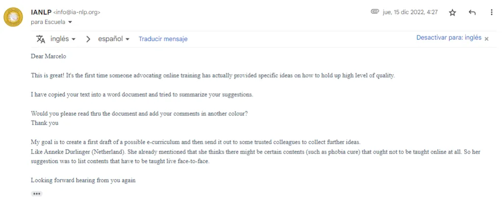 En el año 2022 luego de finalizada la pandemia promoví un cambio en las politicas de la IA-NLP, uno de los cambio más grandes del último tiempo; gracias a mi trabajo, junto con otros 7 colegas desde el febrero del 2022 la IA-NLP de Suiza aprobó la nueva curricula para que puedan dictarse certificaciones On Line.